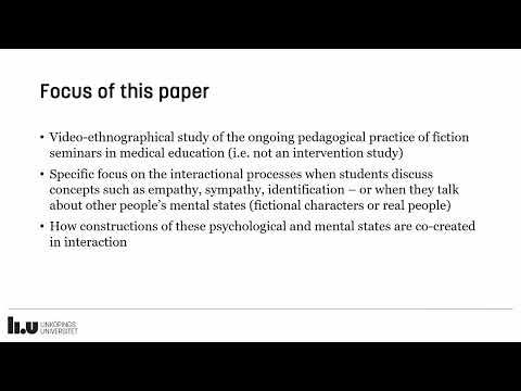 Within the medical profession, empathy is a professional skill connected to increased patient satisfaction and greater quality of care (e.g., Derksen et al., 2013). Empathy is also seen as a central aspect of professional identity development in medical education (Zhou et al., 2021). Meanwhile, despite focused pedagogical efforts, studies have shown that medical students’ empathy declines during their education (Sulzer et al., 2016). Fiction seminars have been used for professional development with the aim of supporting medical students’ empathy and self-knowledge. However, the potential for empathy development through fiction seminars has previously not been studied from a classroom perspective.