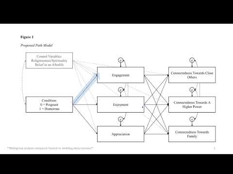 Abstract (long version below): This study aimed to identify measurable types of self-transcendent media content by varying narrative tone (humorous vs. poignant) and context (wedding vs. funeral). Four story versions were created and tested for their effects on connectedness through narrative engagement, enjoyment, and appreciation. Utilizing a path model and multigroup analysis, the study found consistent levels of connectedness across the story versions, pointing to the role of the subjective audience experience rather than of the particular content elements.